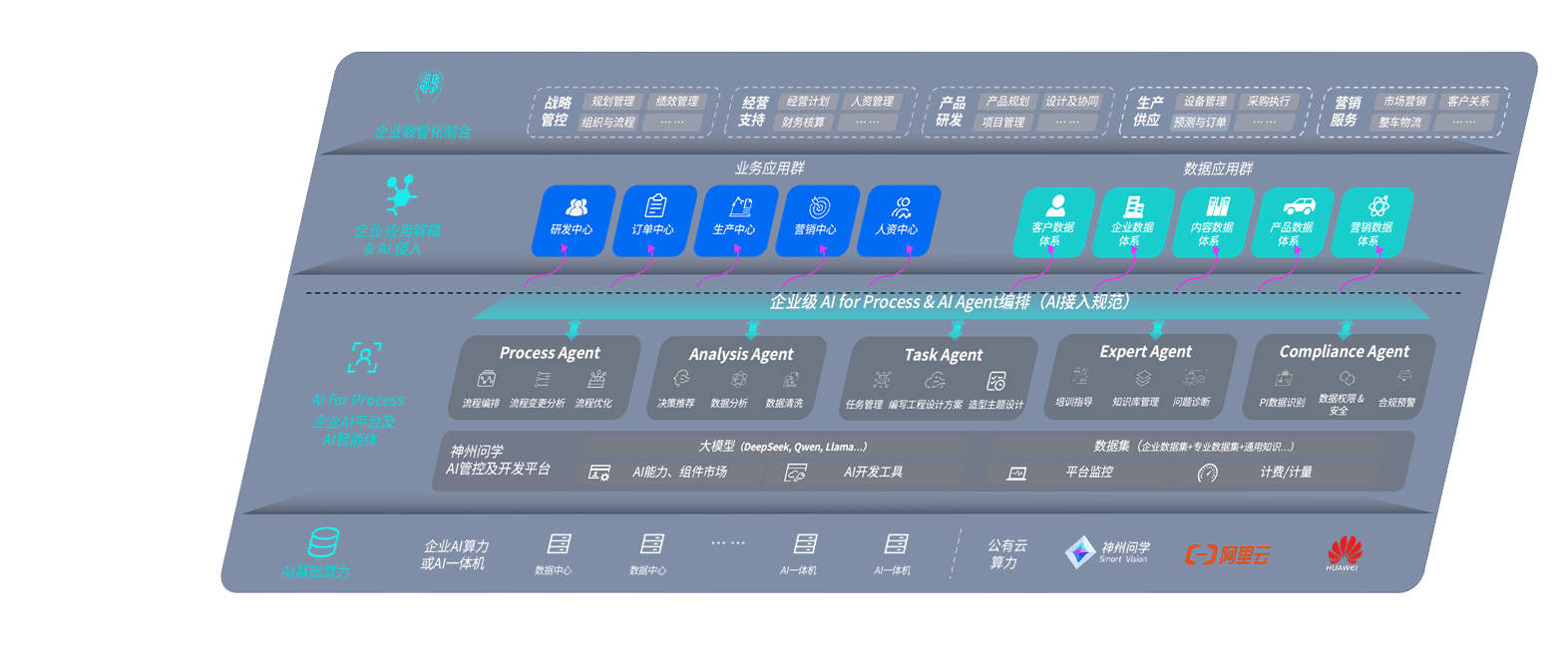 端到端的一站式AI工作空间深度融合了从企业战略规划到日常经营的全流程业务板块,,,,定向解决车企内部领域多、、、部门多、、链条长、、、场景碎片化等难题,,,支持车企快速构建以AI为核心的生产力写作体系,,,实现任务执行与AI能力的无缝集成与交互