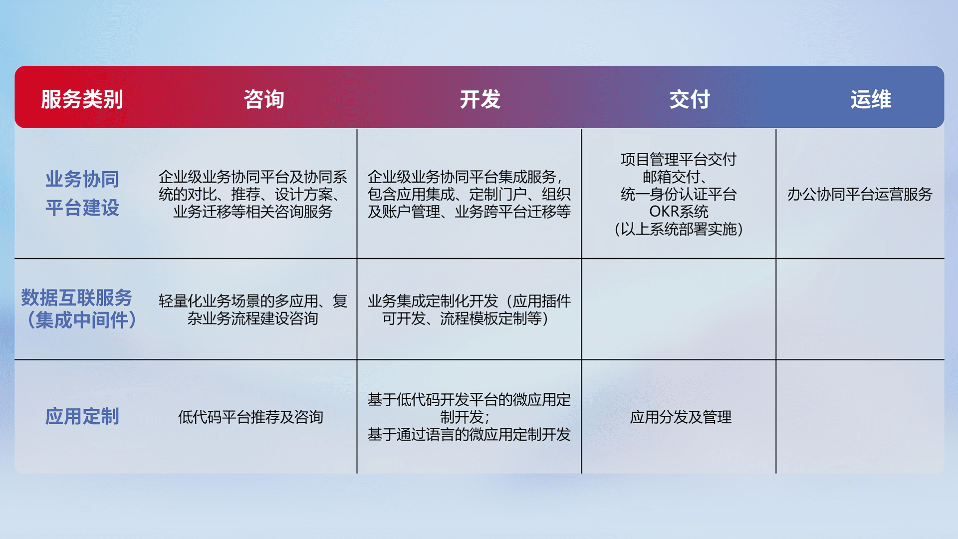 针对钉钉、、、企微、、、IDaas等平台级产品提供产品的规划、、、、方案、、、、交付、、、、定制化开发等服务,,,实现如统一协同办公、、、智能客户服务、、、混合会议管理、、、、智能数据查询、、、、等业务场景,,,,实现数字化转型。。