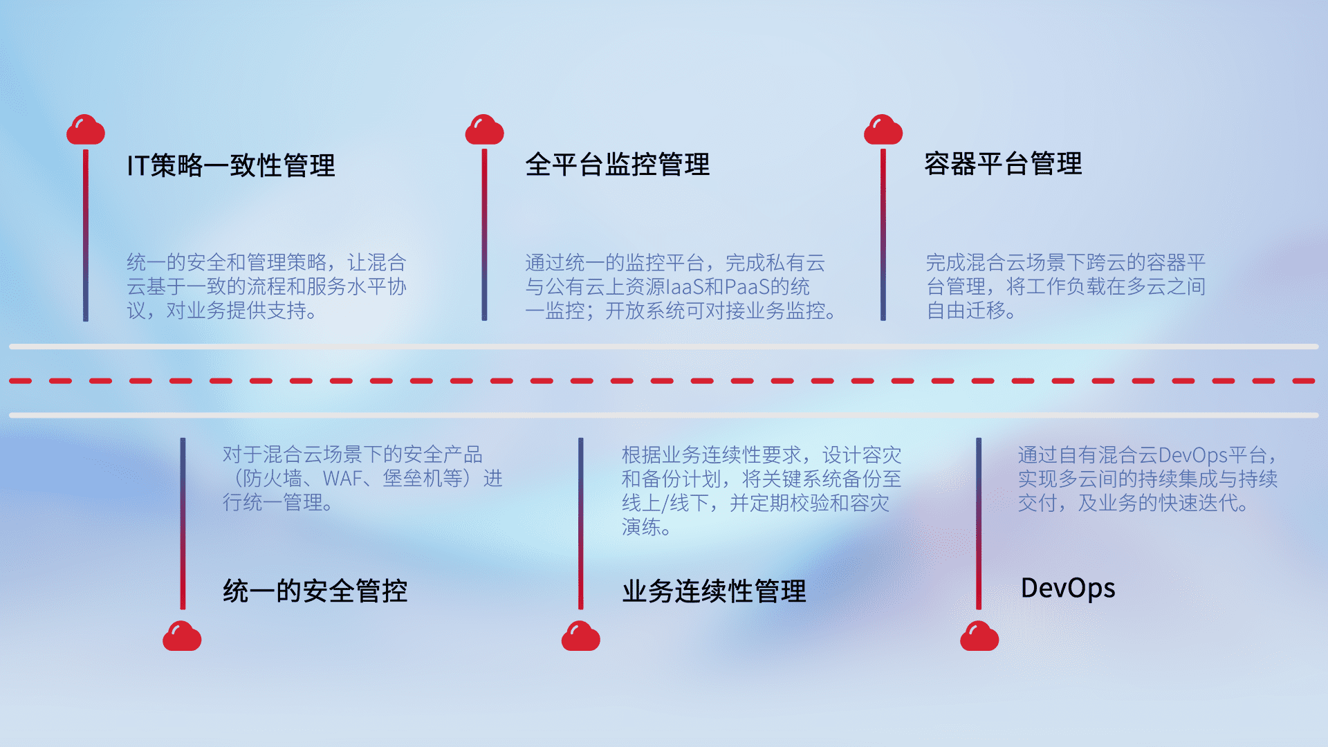 通过多云纳管,,,,以统一的资源数据模型把客户的云资源进行抽象和封装,,,,进而实现对多云资源的统一操作,,,,保障云资源管理的可靠性、、、、稳定性与可用性。。。。量身定制化运维内容,,,,配置、、开发运维、、、、补丁管理、、备份、、、监控、、、认证和访问管理、、、审计和日常巡检等,,保障在用云过程中的可靠度,,,稳定度以及高可用率。。